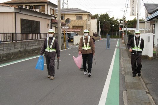 自主防犯パトロール隊は、数名で班を編成し、毎週自治会内を巡回しています。巡回中には、住民の方々や下校途中の小学生と気持ちの良い挨拶を交わすとともに、併せて吸い殻やペットボトルなどのゴミ拾いも行っています。