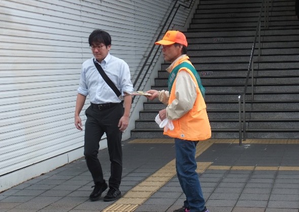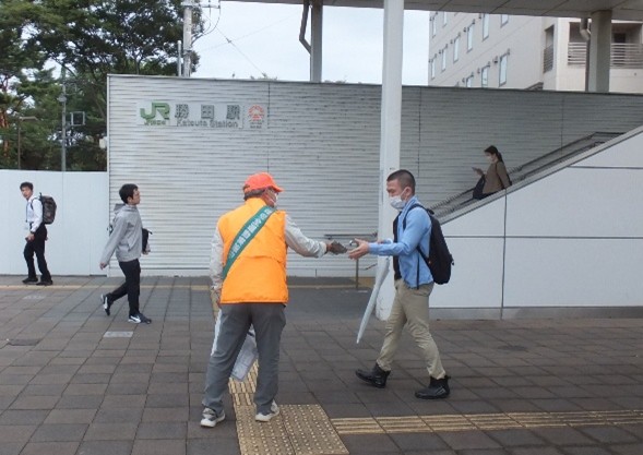 毎年春と秋の2回全国地域安全運動が実施されるのに合わせ、当自治会でも防犯街頭キャンペーンとして、勝田駅周辺で防犯グッズ配布に協力している