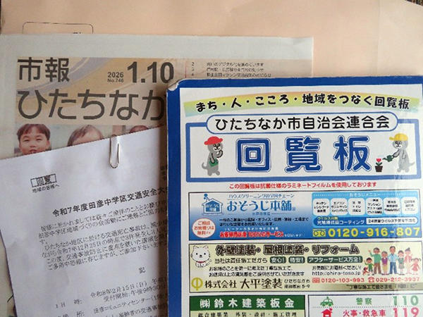 地域への情報提供として、月2回(10日,25日)会員へ回覧物によるお知らせ等を行っています。情報内容は、自治会や地域コミュニティー組織の配布物や行政等からの配布物をとりまとめ回覧しています。